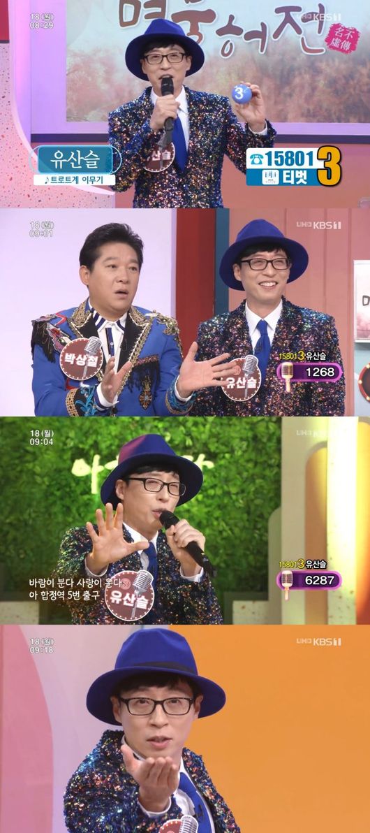 유산슬은 데뷔 앨범 준비 과정에서 무대 매너에 대한 도움을 받은 ‘트로트 황제’ 박상철과 함께 출연해 쟁쟁한 신인 트로트 가수들과 경쟁을 펼쳤다. 유산슬은 지난 16일 발매된 ‘합정역 5번 출구’ 열창은 물론 개인기까지 만능 트로트 샛별의 매력을 뿜어냈다.