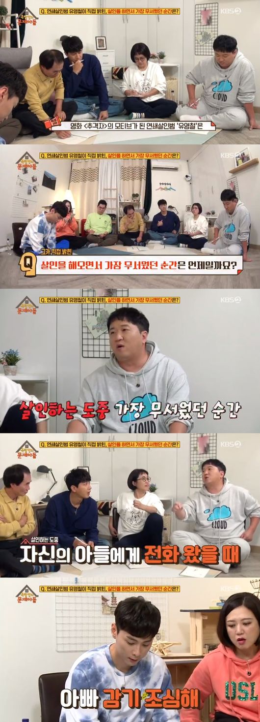 이에 김승현은 "살인을 할 때 내 모습을 봤을 때"라고 말했다. 하지만 이는 정답이 아니었다. 정형돈은 "유영철이 희대의 살인범이지만 아들을 엄청 사랑했던 아버지였다. 살인을 하던 중 아들에게 전화가 오면 무서웠다고 하더라"라고 말했다. 민경훈은 이 정답에 더 추가하며 "아들이 감기 조심해라고 물었을 때 같다"라고 말했다.