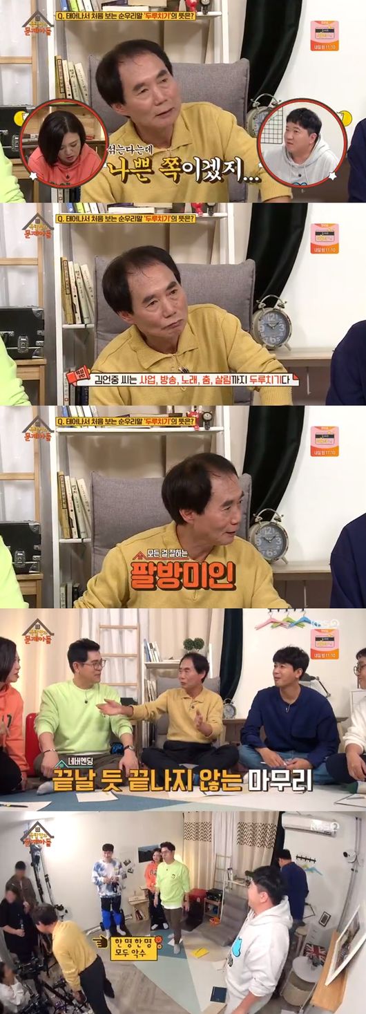 이날 김언중은 '옥탑방의 문제아들'의 고쳐야 할 점을 지적하며 "1등하면 상금을 줘야 한다"라고 말해 웃음을 자아냈다. 김숙은 "아버님이 다르다. 개그 생활 20년 해도 유행어가 없는 사람이 많은데 아버님은 유행어가 있다"라고 말했다. 김언중이 평소 '이 사람아'라고 이야기 하는 것.