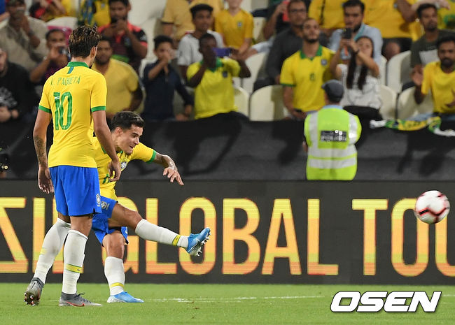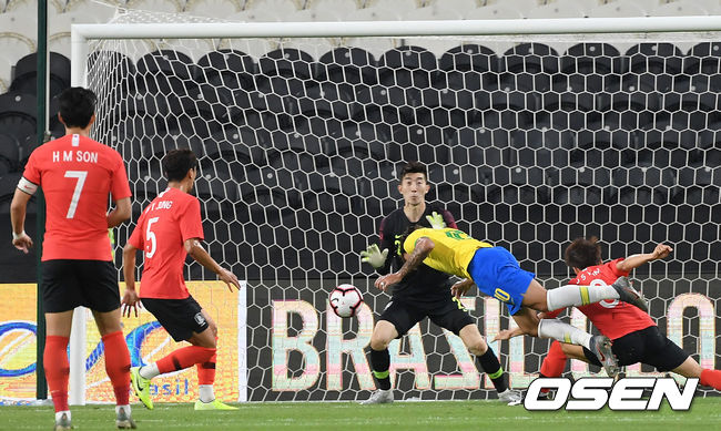 한국은 전반 42분 아크 부근에서 프리킥 기회를 맞았다. 정우영은 수비벽 아래를 통과시키는 재치있는 슈팅으로 알리송을 위협했다. 알리송의 잡아내지 못한 공은 수비가 가담한 쿠티뉴가 걷어냈다.