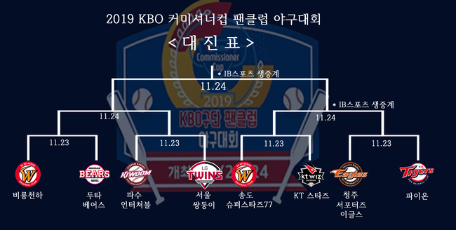 한편, 이번 KBO 커미셔너컵 팬클럽 야구대회 경기 방식은 토너먼트로 열린다. 무승부일 경우 대표선수 추첨(주사위 등)으로 결정한다. 상금은 우승팀에 100만원, 준우승팀에 50만원, 공동 3위팀에 30만원씩 각각 주어진다.