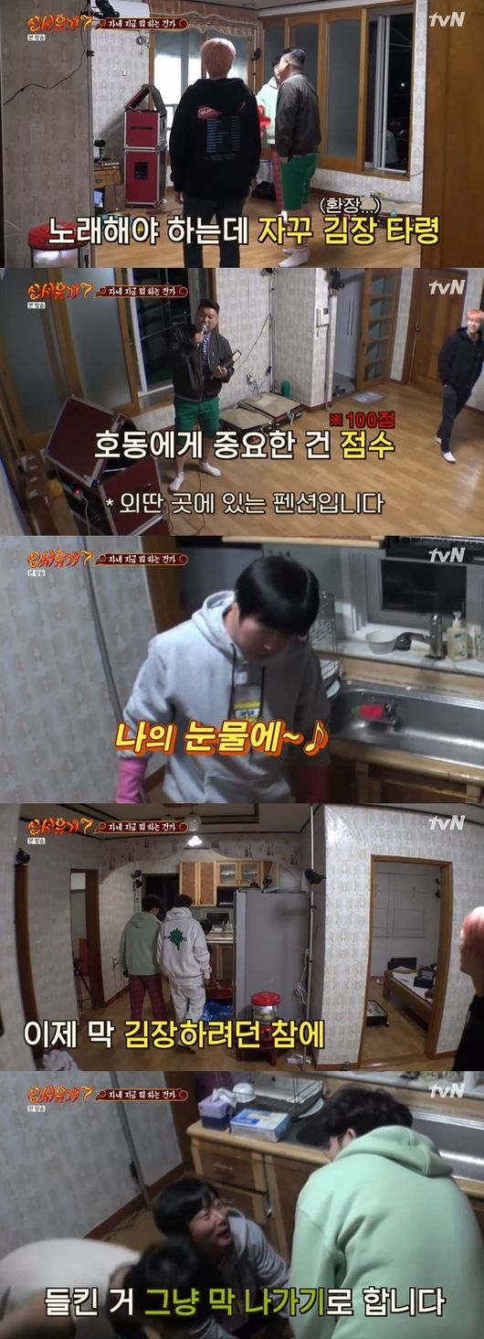 그 사이 강호동은 노래를 불렀다. 하지만 절인 배추를 밖으로 옮긴 송민호가 노래방 기계를 껐다. 그러나 1절을 다 부른 강호동은 점수를 받았고 점수는 97점이었다. 강호동은 아쉬운 눈길을 감출 수 없었다. 이를 본 송민호는 "호동이 형 미션은 백 점 나오는 것"이라고 눈치챘다.