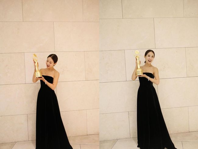 공개된 사진 속에는 조여정이 청룡영화상 시상식 직후, 여우주연상 트로피를 들고 있는 모습이 담겨 있다. 얼굴 가득 행복한 미소가 번져 있고, 여우주연상의 여운이 남은 듯한 표정이다.