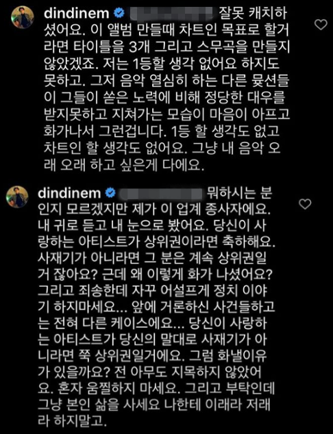 하지만 해당 네티즌은 사재기인 것이 판명난 것 없다며 딘딘을 향해 선동꾼에 지나지 않는다고 지적한 뒤 광우병 파동 등을 언급했다. 이에 딘딘은 "뭐하시는 분인지 모르겠지만 제가 이 업계 종사자"라며 내 귀로 듣고 내 눈으로 봤다. 당신이 사랑하는 아티스트가 상위권이라면 축하한다. 사재기가 아니라면 그 분은 계속 상위권일것이지 않나. 근데 왜 이렇게 화가 났냐"고 반박했다.