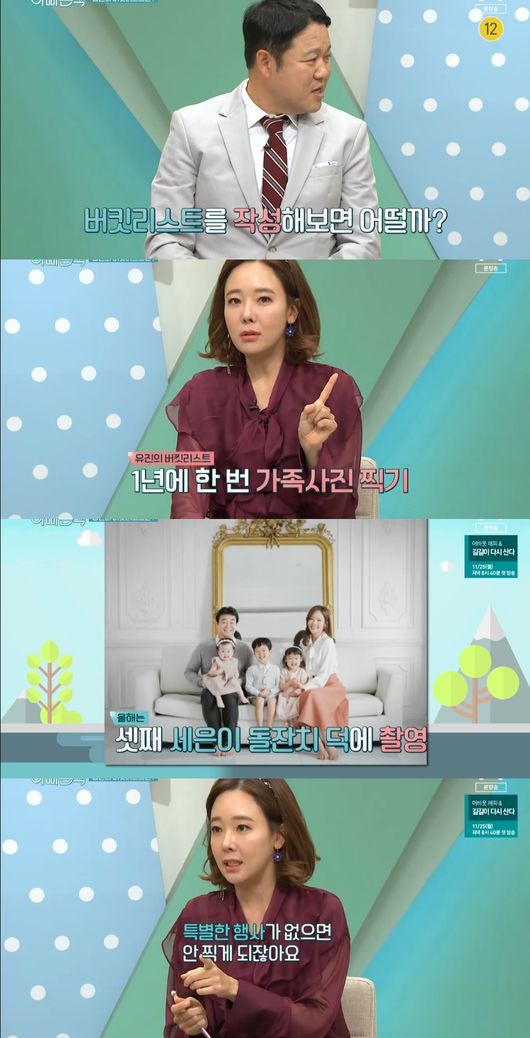 24일 방송된 채널A 예능 '아빠본색'에서 다가올 2020년을 앞두고 버킷리스트를 물었다. 소유진은 "1년에 한 번 가족사진 찍는 것이 버킷리스트"라면서 "올해는 셋째 세은이 돌잔치 덕에 찍었다, 이렇게 특별한 행사가 있어야 찍는다"며 가족들과의 버킷리스트를 지키고 싶다고 했다.