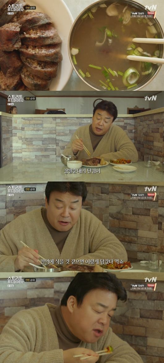 백종원은 "찹쌀 순대다. 여태까지 찹쌀 들어간 순대 먹어본 것 중에 일등이다. 한국의 순대와는 다르다. 병천순대, 백암순대와 전혀 결이 다르다. 밥같다. 김밥 먹는 것 같은 느낌"이라고 전했다. 이어 내장의 고소함이 느껴진다. 찹쌀 순대의 단점이 쉽게 단단해진다. 그럴 때는 국물에 담가서 먹으면 된다"고 전했다.