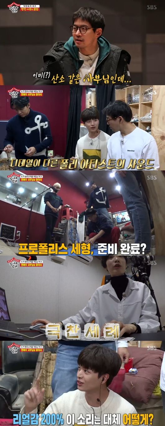 갑작스럽게 폴리사운드 실전편이 그려졌다. 영화 속 장면에 들어갈 효과음을 만드는 것이 사부의 미션이었다. 창의적인 소리를 찹기 위해 모두 머리를 모았고, 각자 자신만의 악기를 찾는 것에 집중했다.