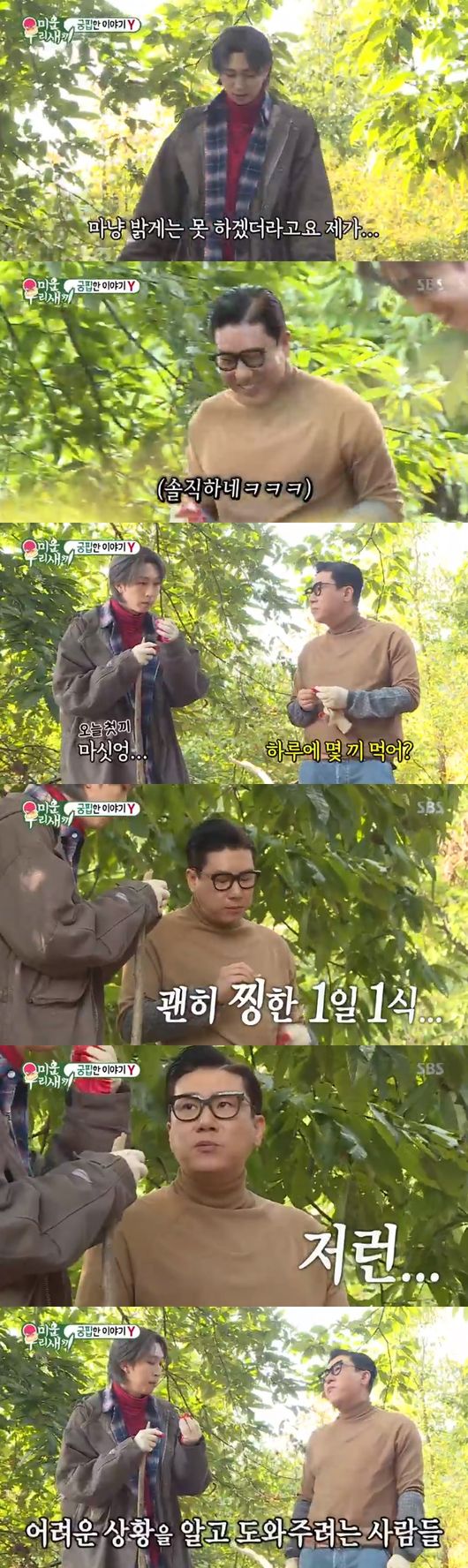 이상민은 직접 밤을 까주며 "아침 먹었냐"물었고 못 먹었다는 말에 "하루 몇 끼 먹니"라고 되물었다. 이에 슬리피는 "하루 한 끼 먹었다. 안 먹다 보니 위가 작아져서 그런지 많이 못 먹게 된다. 그래도 지금은 두 끼 먹는다"고 대답했다.