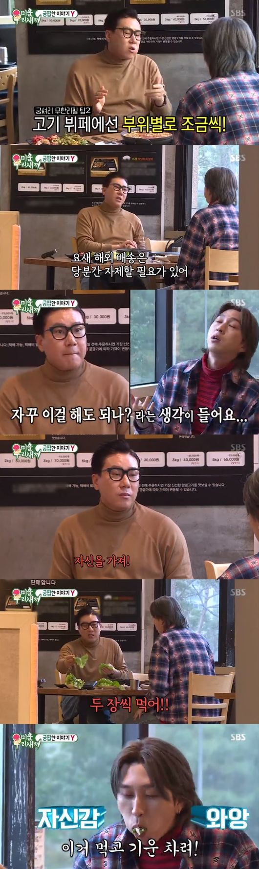 이후 두 사람은 식당으로 향했다. 이상민은 "오늘은 풀로 먹을 수 있는 곳으로 정했다"며 양념 없는 것부터 먹어야 한다며 등심, 부챗살 토시살을 그릇에 담았다. 슬리피는 "요새 고기를 못 먹었다. 누가 고기를 사줬는데 거기서 사인을 해달라고 해서 했다. 그럼 그게 sns로 올라온다. 그러면 슬리피 소고기 먹고 다닌다는