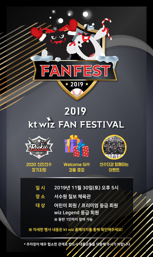 체육관 구역별로 선수들이 팬과 함께 즐기는 이벤트가 준비되고 팬들이 직접 뽑은 ‘2019 kt wiz fan awards’를 신설했다. 최고의 팬 서비스를 선사한 선수에게 주어지는 ‘연쇄싸인마상’, 2019 시즌 명장면을 기념하는 ‘씬 스틸러상’, 기량 발전이 눈에 띈 ‘2019 연구대상’, 탁월한 사복 패션감각을 가리는 ‘배스트 드레서상’, 마지막으로 올 시즌 최고의 활약을 보인 ‘2019 kt wiz 올해의 선수상’이 수여된다.