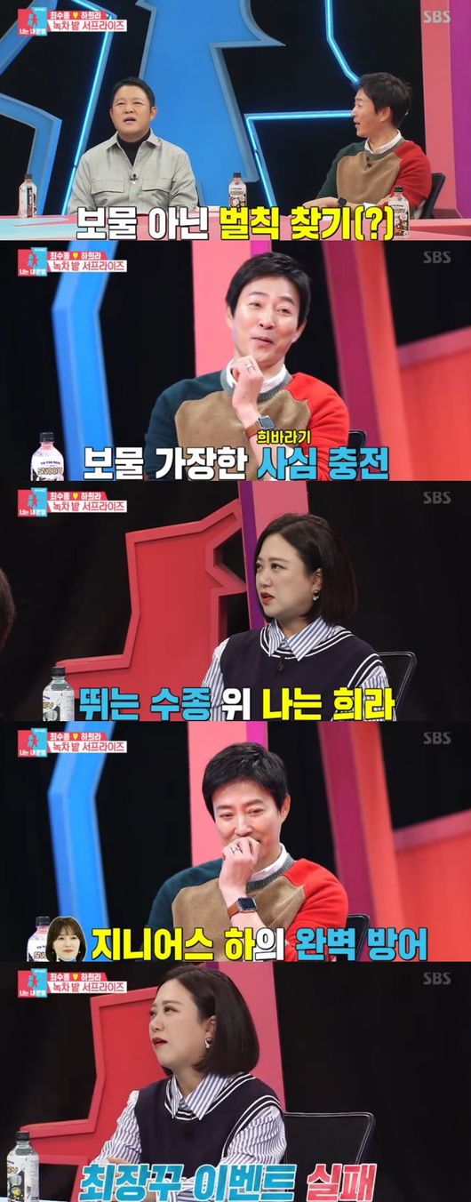 이때, 종이를 발견한 하희라는 '애교'라 적힌 미션에 웃음이 터졌다. 최수종은 "선물이 애교, 나한테 애교를 보여줘한다"며 미소지었다. 이에 하희라는 "곰이 재주를 부려라, 뭐 이런 걸 하냐"며 투덜, 패널들도 "보물 아닌 벌칙찾기"라며 비난했다. 최수종은 "보물을 가장한 사심 충전"이라고 해 명불허전 희바라기 모습을 보였다.
