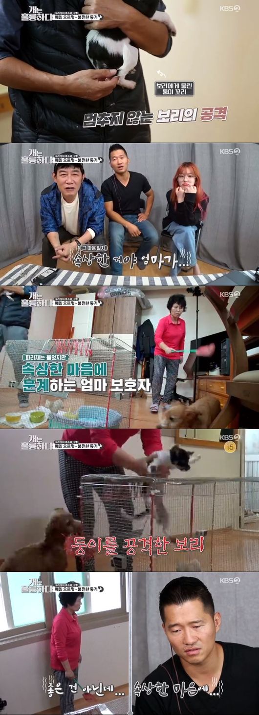 강형욱은 "둥이가 성견이 되면 보리를 쥐어 잡을 거다. 보리는 점점 약해지고 둥이는 더 세질거다. 그러면 나중에 사생결단으로 싸우는 경우가 있을 것"이라고 말했다. 이에 이경규는 "사연을 다 듣고 보니 강아지 세 마리 모두 안돼 보인다"라고 말했다.