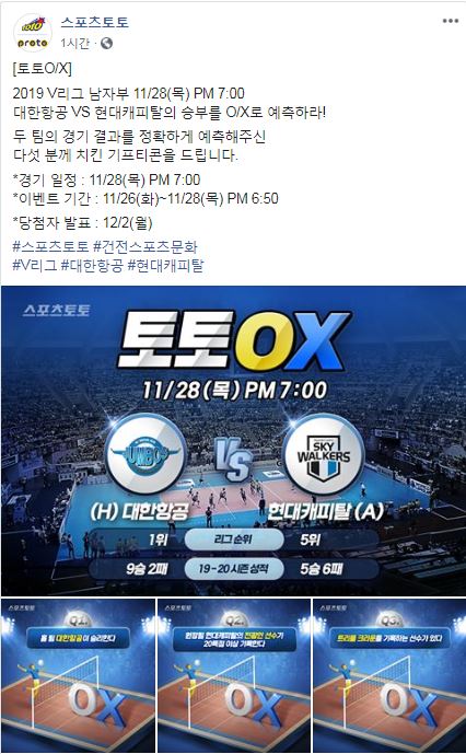체육진흥투표권 스포츠토토의 수탁사업자인 ㈜케이토토(www.ktoto.co.kr)가 공식 페이스북(www.facebook.com/sportstoto.toto.proto)을 통해 국내프로배구 경기를 대상으로 승부를 맞히는 ‘토토 O/X’ 이벤트를 진행한다.