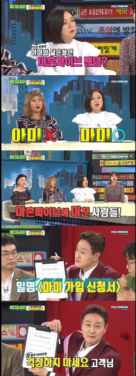 김원효는 BTS와 마흔 파이브의 공통점을 언급하며 "BTS의 팬클럽 이름은 아미이고 우리는 마미다. 마흔 파이브에 미친 사람들이라는 뜻"이라고 말했다. 이날 마흔 파이브는 마미 가입 신청서를 보여줘 눈길을 끌었다.