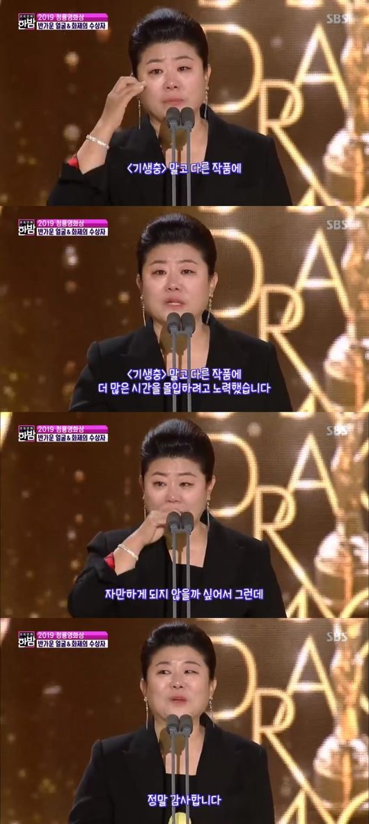 이날 여우 조연상 역시 기생충의 이정은이 수상, "너무 뒤늦게 빛을 보게 되어서 스스로 초심을 잃을 것 같아서 걱정했는데 수상을 하고 보니, 며칠 좀 쉬어도 될 거 같다"라는 소감을 남겨 청중들에게 감동을 안겼다.