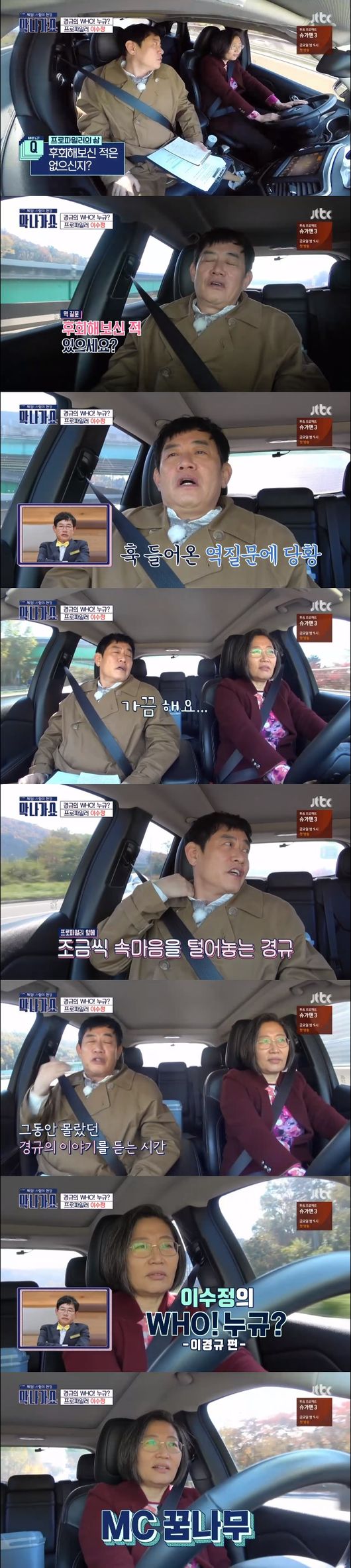 경규는 수정의 별명을 물었다. 이어 "대학교때 별명은 오리같다"고 했고 경규는 웃으면서 아무 대답을 하지 못했다. 이어 "후회 한 적 있냐"고 경규가 수정에게 물었고 수정은 "글쎄요" 라고 하면서 역질문을 했다. 이에 경규는 후회 했던 순간에 대해서 계속 말을 늘어놨다. 이어 수정은 경규에게 어떤 영화를 만들지, 낚시는 어떻게 하는지, 반려견은 어떻게 키우는지 물었다. 스튜디오의 경규는 "말리고 있는 줄 전혀 몰랐다"면서 그녀의 실력을 가늠하게 했다. JTBC '막나가쇼' 방송화면 캡처
