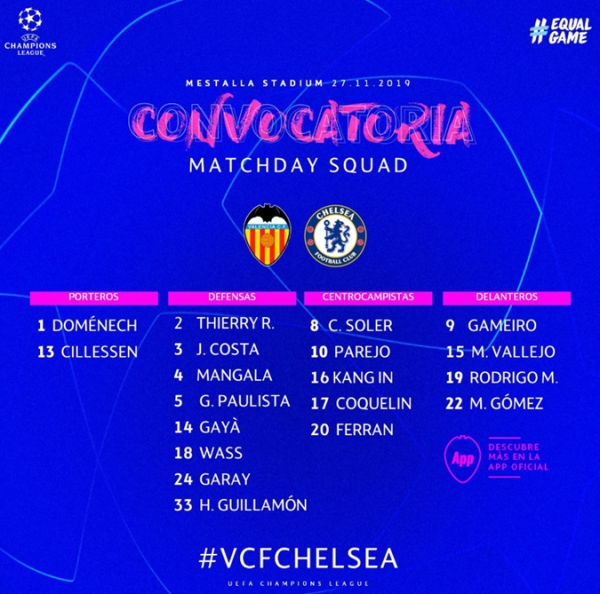 발렌시아는 오는 28일(한국시간) 스페인 발렌시아 메스타야에서 2019-2020 유럽축구연맹(UEFA) 챔피언스리그 조별리그 H조 5차전 경기를 펼치다. 상대는 첼시.