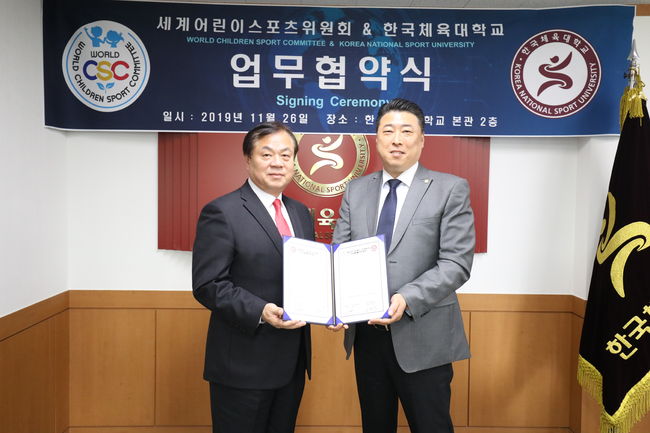 한국체육대학교는 26일 서울 송파구 한국체대 총장실에서 세계어린이스포츠위원회와 업무협약을 체결했다. 양 기관은 이번 협약을 기기로 어린이스포츠와 관련된 다양한 활동을 함께 해나갈 예정이다.
