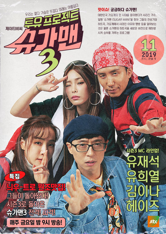 JTBC ‘투유프로젝트-슈가맨3’(이하 ‘슈가맨3’)가 오는 29일 금요일 밤 9시에 첫 방송된다. ‘슈가맨3’는 한 시대 가요계를 풍미했다가 사라진 추억 속 가수와 노래를 찾는 프로그램이다. 두 시즌 동안 무려 124팀을 소환했고 최근 ‘온라인 탑골공원’ 등으로 대표되는 뉴트로(New-tro) 음악 열풍의 원조 격으로 사랑받아왔다.