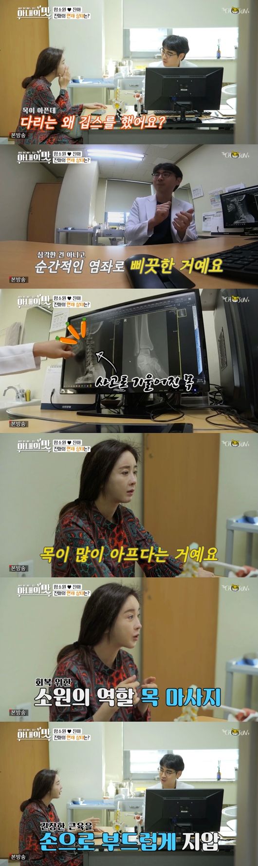 진화의 담당 의사는 "목이 지금 많이 아픈 상태다. 다리가 부러진 건 아니고 순간적인 염좌 증상이다. 발목은 그렇게 걱정을 안 해도 되는데, 목이 문제다. 목이 일자 상태에 앞으로 기울어 질 것 같다. 근육이 긴장하고 힘들 것 같으니, 부드럽게 마사지를 하면서 좋을 것 같다. 낮은 베개나 누워서 생활하는 게 좋다"고 진단했다.