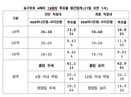 국민체육진흥공단이 발행하는 체육진흥투표권 스포츠토토의 수탁사업자인 케이토토는 오는 28일(목) 오후 7시에 부천실내체육관에서 열리는 KEB하나은행(홈)-우리은행(원정)전을 대상으로 한 농구토토 W매치 78회차 투표율을 중간 집계한 결과, 전체 참가자의 62.95%가 KEB하나은행의 승리를 예상한 것으로 나타났다고 밝혔다.