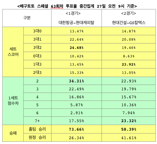 원정팀 현대캐피탈의 승리 예상은 26.34%의 투표율을 기록했고, 최종 세트스코어에서는 3-2 대한항공 승리 예상(24.68%)이 가장 높게 집계됐다. 1세트 점수차 예상에서는 2점차(34.31%)가 1순위로 집계됐다.