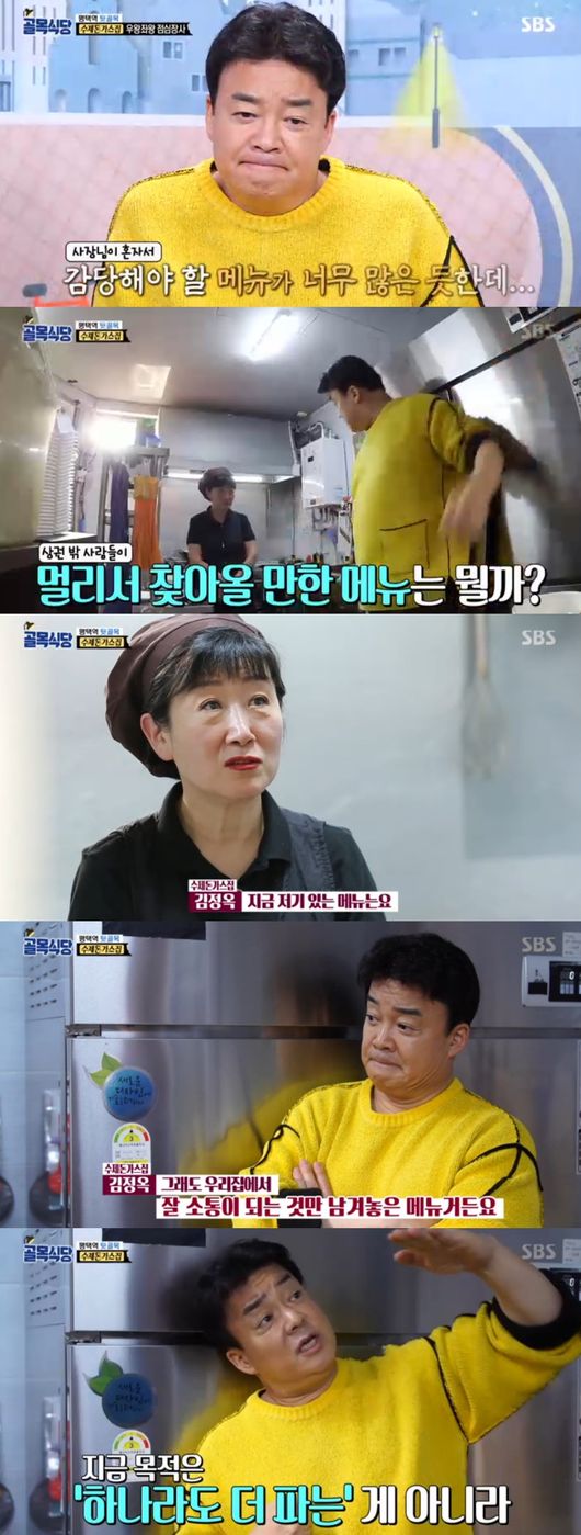 백종원은 자신있는 메뉴 하나로도 벅찰텐데 왜 굳이 저 많은 메뉴를 선택한 건지 의아해했다. 사장은 "동네의 특성상, 메뉴가 적다고 하는 손님들 때문에 늘려간 메뉴들"이라면서 "손님들이 찾는 메뉴 중 하나라도 팔기 위한 것"이라며 토로했다. 잘 소통이 되는 메뉴만 남겨놓았다고 하자 백종원은 "하나라도 더 파는 게 목적이 아니라 지금보다 후러씬 높은 매출을 목표로 잡으려면 멀리서 찾아오게 만들어야 한다"며 차별화를 강조했다.