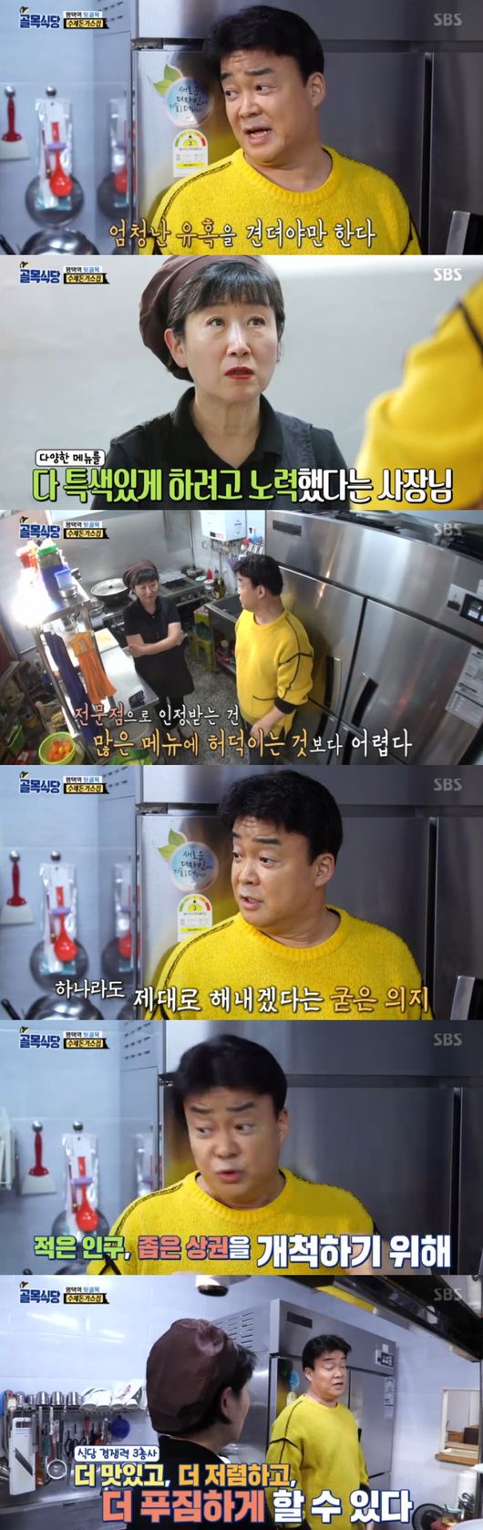 백종원은 전문점으로 인정받는 건 많은 메뉴에 허덕이는 것보다 어렵다고 했다. 백종원은 "사장님이 구구절절하는 말이 맞는 것 갖죠? 지금 필요한 건 손님들이 원해서하는 변명보다 하나라도 제대로 해내겠다는 굳은 의지가 필요하다"고 조언했다.