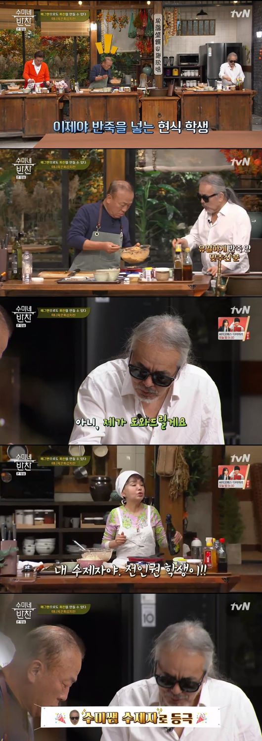 전인권은 칭찬에 자신감을 가졌고 급기야 옆에서 부침개를 부치고 있는 임현식에게 지도를 시작해 주위를 웃음바다로 만들었다. 김수미는 "전인권씨는 내 수제자다"라고 말해 웃음을 자아냈다.
