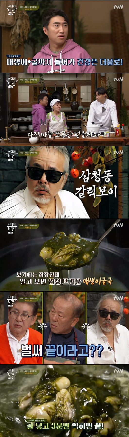 한편, 이어서 매생이굴국 요리가 시작됐다. 김수미는 "매생이가 제철이다. 지금 매생이굴국을 먹는 건 보약을 먹는 것과 같다"라고 설명했다. 장동민은 "매생이는 미운 사위한테 준다고 하지 않냐. 나도 예전에 이걸 먹고 입천장이 까진 적 있다"라고 말했다.