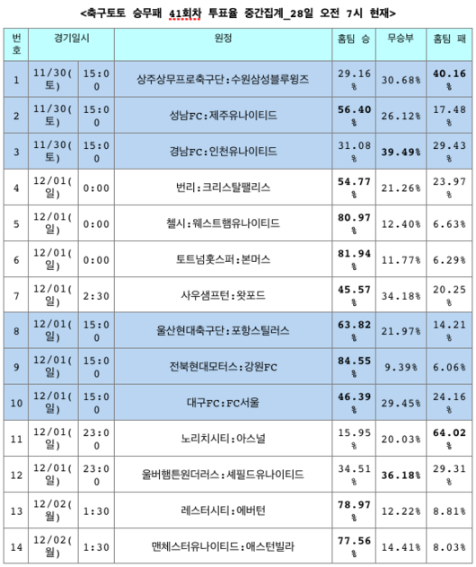한편, 이번 승무패 41회차는 오는 11월 30일(토) 오후 2시 50분에 발매를 마감하며, 경기가 모두 종료된 후에 결과가 공식 발표된다.