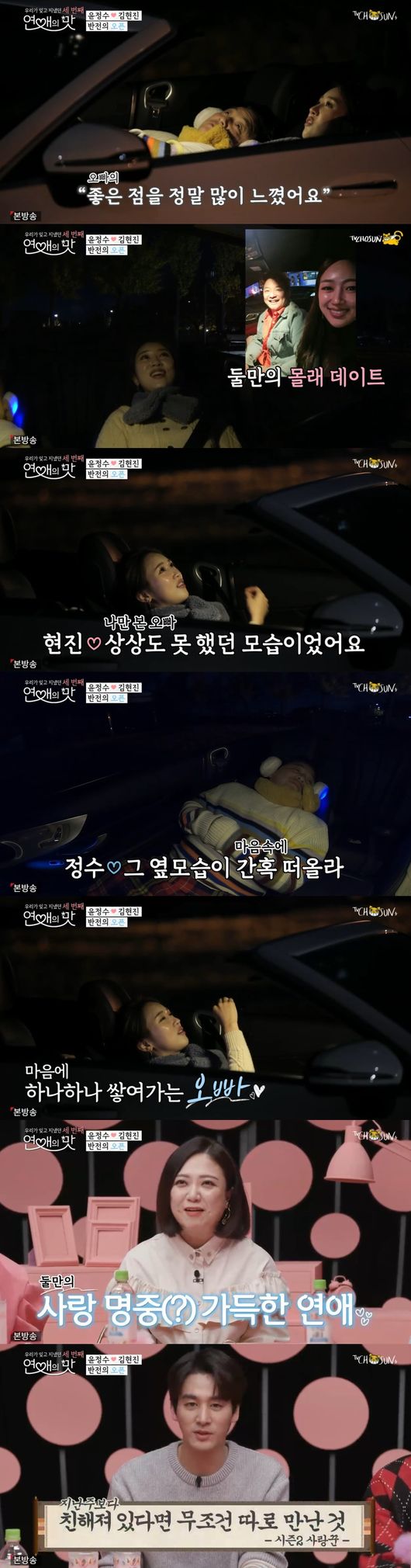 현진은 "따로 둘이 만났던 날, 오빠의 좋은 점을 많이 느꼈다"면서 "천진난만하게 맛있게 먹는 모습이 상상도 못 했다, 엄마미소가 지어지던 표정"이라며 떠올렸다. 그러면서 "계속 다른 모습이 궁금해지는 사람"이라면서 "오빠라는 사람을 차곡차곡 쌓고 잇다"고 했다. 이에 윤정수는 부끄러워하면서 "옆모습의 눈이 참 예쁘다"면서 "가끔 그 옆모습이 간혹 떠오른다"며 쌍방 고백했다.