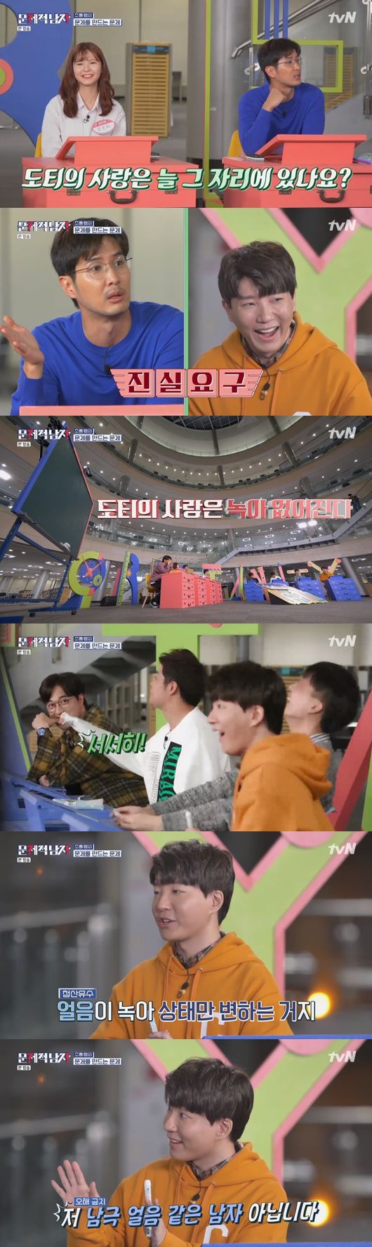 도티는 "지속 변화의 문제다"라고 정답을 설명했다. 이에 김지석은 "그래서 도티씨의 사랑은 그대로 있냐. 솔직하게 말해달라"라고 말해 웃음을 자아냈다. 이에 전현무는 "도티의 사랑은 4번 아니냐"라고 물었다. 도티는 "녹아 없어진다는 뜻이냐. 그건 아니다"라고 말해 주위를 웃음바다로 만들었다. 이어 도티는 "지금은 솔로지만 나는 남극 얼음 같은 남자가 아니다"라고 말해 눈길을 끌었다.