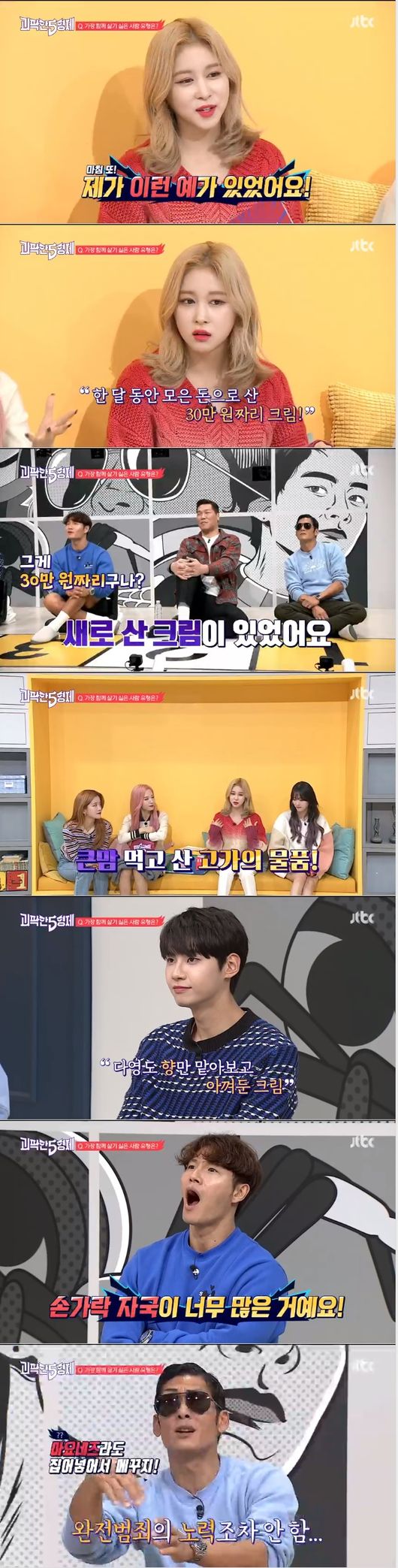 다영은 "너무 비싼 크림을 산 적이 있었다. 향만 맡아보고 한달 뒤에 쓰려고 닫아뒀는데 한달 뒤에 열었더니 손가락 자국이 너무 많이 남아 있었다. 근데 억울한 게 범인이 안나온다"고 했다.