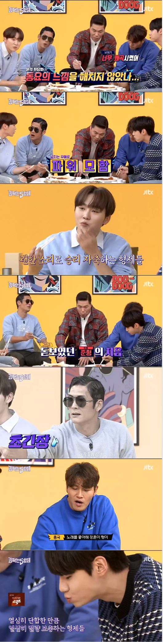 형제들의 자유곡은 <어머님께> 였다. 진혁은 "태우형이 여기 있다"면서 서장훈을 가르켰다. 이에 장훈은 "하지만 노래는 종국이가 한다"고 했다. 형제들의 열창이 끝난 가운데 98점으로 2점차이의 승리가 결정 됐다. 장훈은 웃으면서 "이거 우리가 미안해서 어떡하냐고 했고, 종국이 "나중에 복수전 하러 오라"고 했다.파전을 먹으며 승관은 "없어서 하는 이야긴데 동요를 너무 퇴색 시키지 않았나"라고 했다. /anndana@osen.co.kr