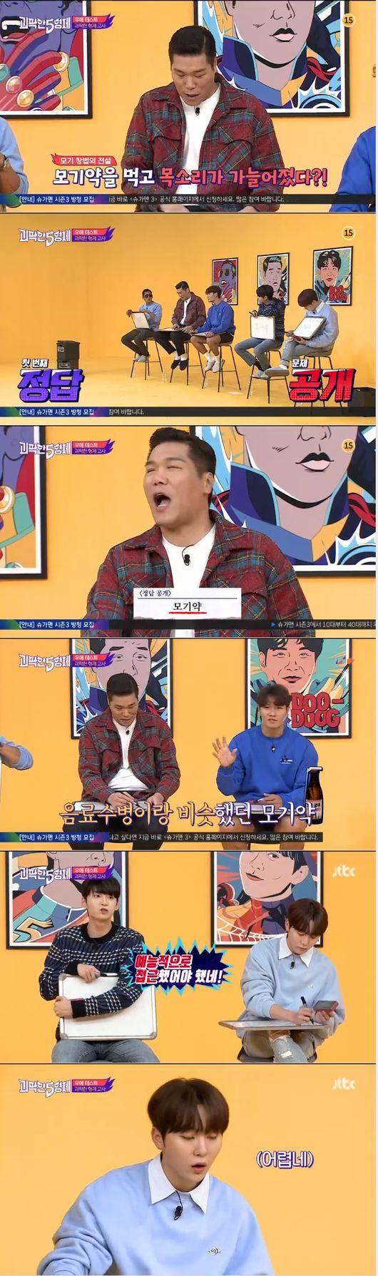 "종국이 어렸을 적 이것을 먹고 목소리가 얇아졌다"는 퀴즈가 이어졌다. 서장훈은 "답을 안다"고 했다. 이어지는 답은 '모기약'이었다. 이어 서장훈의 답이 정답이었다. "예전에는 음료수 병이랑 모기약이 비슷하게 생겼었다"고 했고, "응급실에 가서 위세척 까지 했다"고 말했다. 이에 부승관은 "아 예능적으로 접근을 했어야 했네. 저는 무화과나 석류인 줄 알았다. 여성 호르몬과 관련이 있었을 거 같아서"라고 하자 종국이 "너 형이 남성 호르몬 수치가 몇이 나왔는지 아니"라고 하며 어이없다는 표정을 지었다.