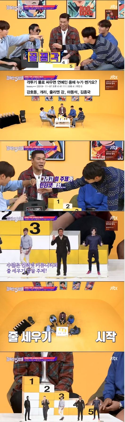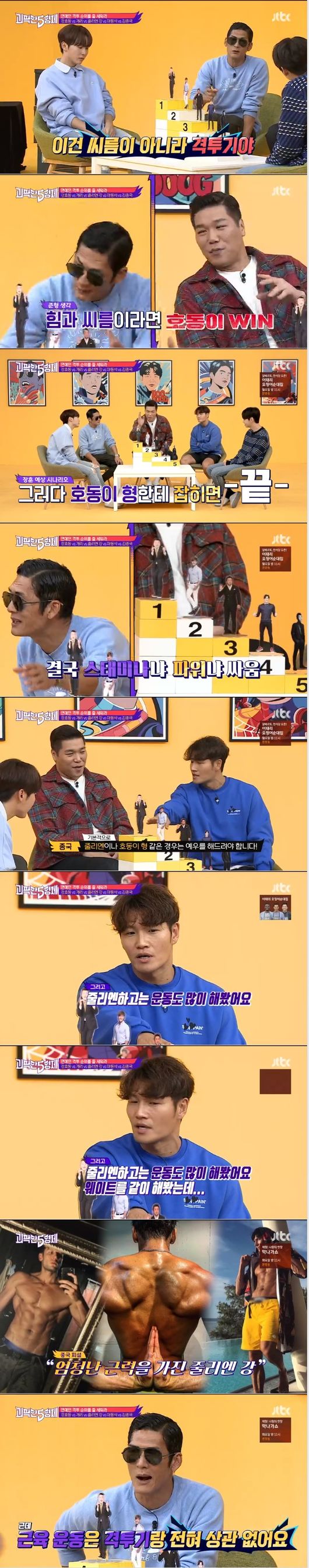 종국은 "줄리엔이나 호동이형은 예우를 해야한다 반 선수기 때문에. 줄리엔이랑 같이 운동을 해봤는데 무척 감이 좋다. 근데 격투기는 근육이랑 상관이 없다. 기질이 제일 중요하다."라고 하며 자신을 5위에 올렸다. 이어 개리와 마동석 줄리엔강 강호동이 이었다. 이어 서장훈은 "젊은 친구들이라면 마동석이 1위. 이미지에서 줄리앤강은 너무 착하다"라고 했다.