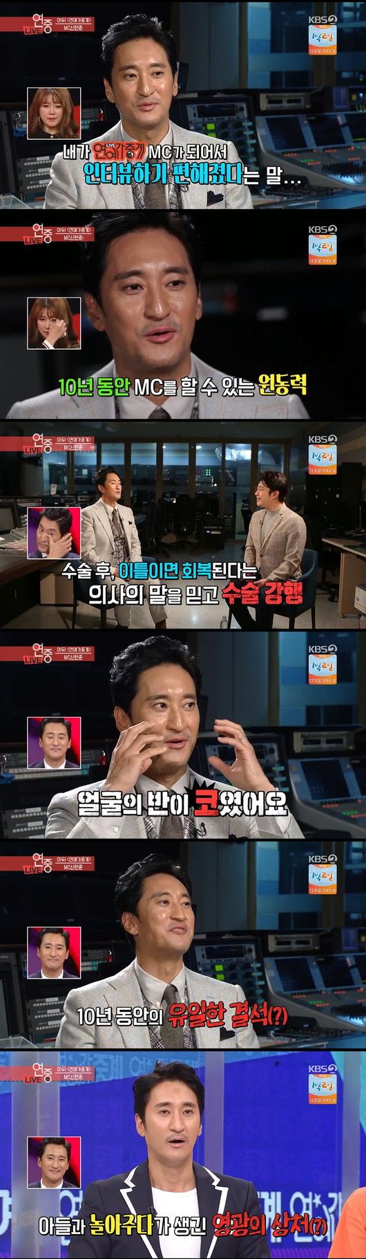 신현준은 MC 중 유일하게 결석을 했던 순간을 떠올리며 "비염 수술을 받았는데 이틀이면 회복이 된다고 했는데 얼굴의 반이 코였다. 첫 마디가 '연예가중계' 어떻게 가냐라고 했다. 그때 처음으로 결석을 했다"라고 말해 웃음을 자아냈다.