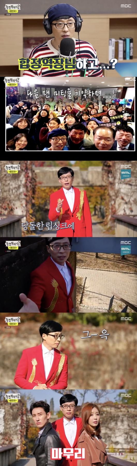 며칠 뒤 유재석은 팬미팅을 진행해 팬들을 만났다. 자신의 노래에 자동 반사한 그는 라이브로 ‘합정역 5번 출구’를 불렀다. 발표한 지 얼마 안 지났지만 많은 팬들이 이미 가사를 외우고 있었다.