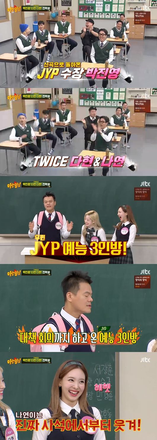 30일 방송된 JTBC 예능 '아는 형님'에서는 나연, 다현의 지원사격을 받아 큰 웃음을 선사한 박진영의 모습이 그려졌다.