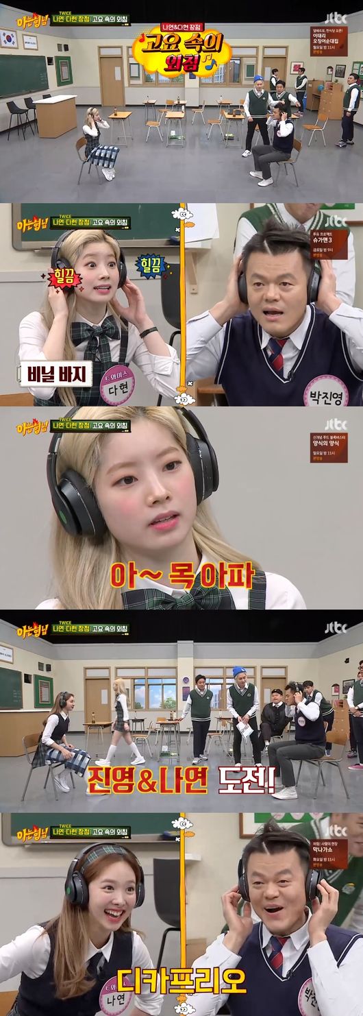 이어 나연과 다현이 장점으로 '고요속의 외침'을 적어냈고 두 사람은 "하고 싶었다"고 말했다. 이어 '고요 속의 외침' 게임을 시작했다. 다현이 문제를 내고 박진영이 맞히는 상황.