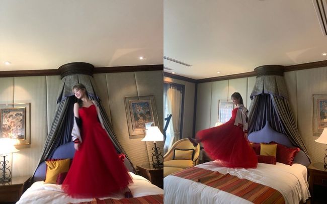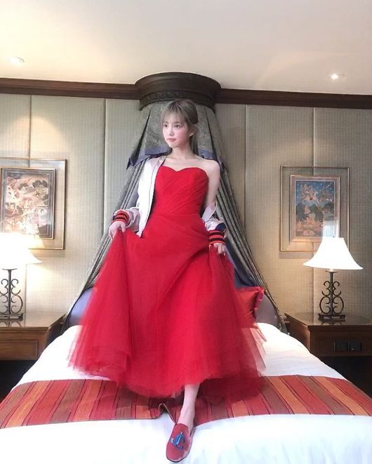 공개된 사진 속에는 이유비가 한 매거진의 화보를 촬영하고 있는 모습이 담겨 있다. 침대 위에 올라선 이유비는 오프숄더 디자인의 레드 롱 드레스를 완벽하게 소화했다. 특히 콘셉트와 분위기에 맞는 다양한 표정과 귀여운 포즈 등으로 시선을 사로잡았다.