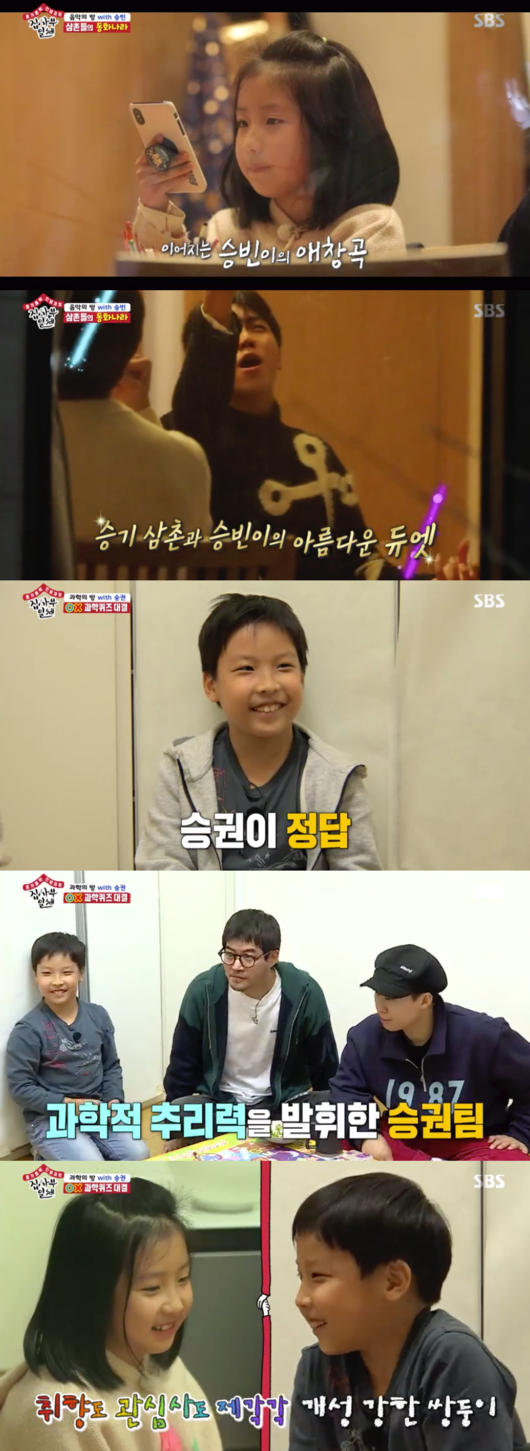 노래하는 걸 좋아하는 승빈 팀 대 공부를 좋아하는 승권 팀의 과학 지식 대결일 벌어졌다. 승권은 삼촌들을 설득시키는 논리로 정답을 모두 맞혔다. 멤버들은 이영애의 극과 극 쌍둥이들을 보며 놀라워했다.