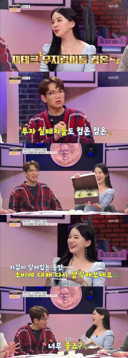 미주는 "돈을 불리고 싶지만 떨어질까봐 무서워서 투자를 하지 못했다"라고 말했다. 이에 댈님은 "요즘은 만원으로도 할 수 있는 소액투자가 있다. 모바일로 간편하게 관리할 수 있으니까 화장실에서도 할 수 있다"라고 말했다.