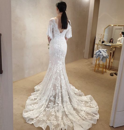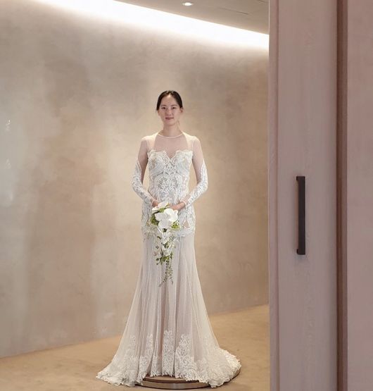공개된 사진 속 혜박은 머메이드 웨딩드레스를 입고 있다. 치마 라인이 풍성하지 않은 대신 유려한 곡선을 그리며 떨어져, 혜박의 슬림한 몸매가 돋보인다. 긴 트레인, 꽃무늬 자수 등 디테일은 그의 우아함을 극대화한다.