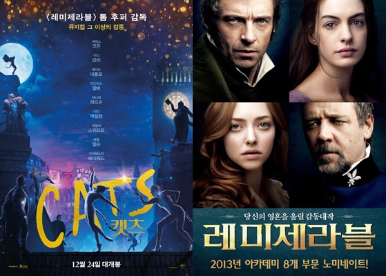 '캣츠'와 '레미제라블'의 첫 번째 평행이론은 바로 세계적인 뮤지컬이 영화로 탄생했다는 점이다. 먼저 '레미제라블'(2012)은 세계 4대 뮤지컬 중 하나인 '레미제라블'을 영화화하여 뮤지컬보다 웅장한 스케일과 배우들의 라이브로 한층 더 깊이 있는 감동을 전해 세계적인 흥행은 물론, 골든글로브 작품상을 수상하며 독보적인 뮤지컬 영화로 자리매김했다.