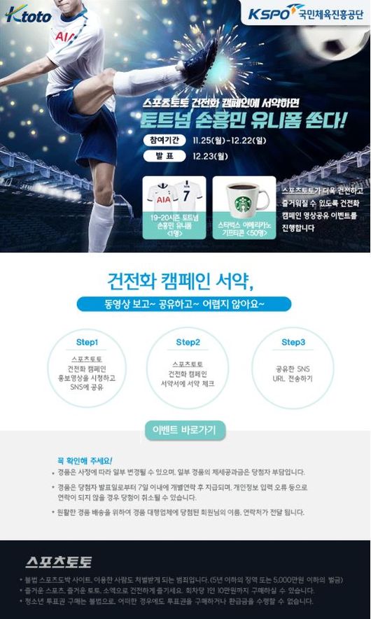 이벤트에 참여한 사람에게는 추첨을 통해 2019-20시즌 토트넘 손흥민의 유니폼(1명)과 스타벅스 아메리카노 기프티콘(50명)을 증정한다.