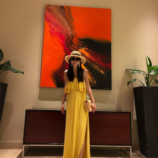 공개된 사진 속 김성은은 노란 민소매 프릴 원피스를 입고 포즈를 취하고 있다. 특히 김성은은 임신 중이라 믿을 수 없을 정도로 마른 몸매로 눈길을 끈다.