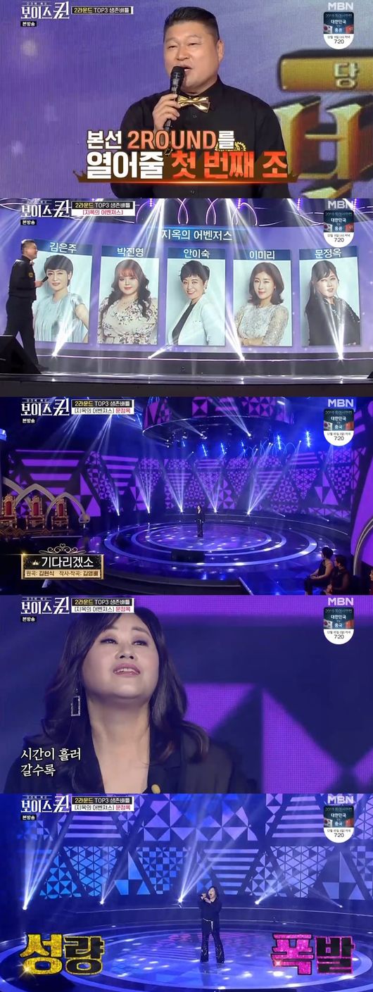 이어 지옥의 어벤저스의 첫 무대는 문정옥이 활짝 열었다. 문정옥 참가자는 파워풀한 성량으로 적우의 '하루만'을 불렀고 태진아는 심사위원들에게 "성량은 정말 좋아"라고 말했고 김혜연은 "강호동씨하고도 밀리지 않을 힘이다. 가슴도 귀도 확 뚫린다"며 칭찬했다. 이에 문정옥 참가자는 800점 만점에 730점을 받았다.