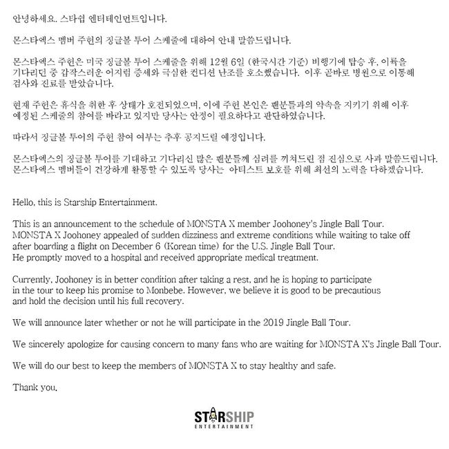 몬스타엑스의 징글볼 투어를 기대하고 기다리신 많은 팬분들께 심려를 끼쳐드린 점 진심으로 사과 말씀 드립니다. 몬스타엑스 멤버들이 건강하게 활동할 수 있도록 당사는 아티스트 보호를 위해 최선의 노력을 다하겠습니다.